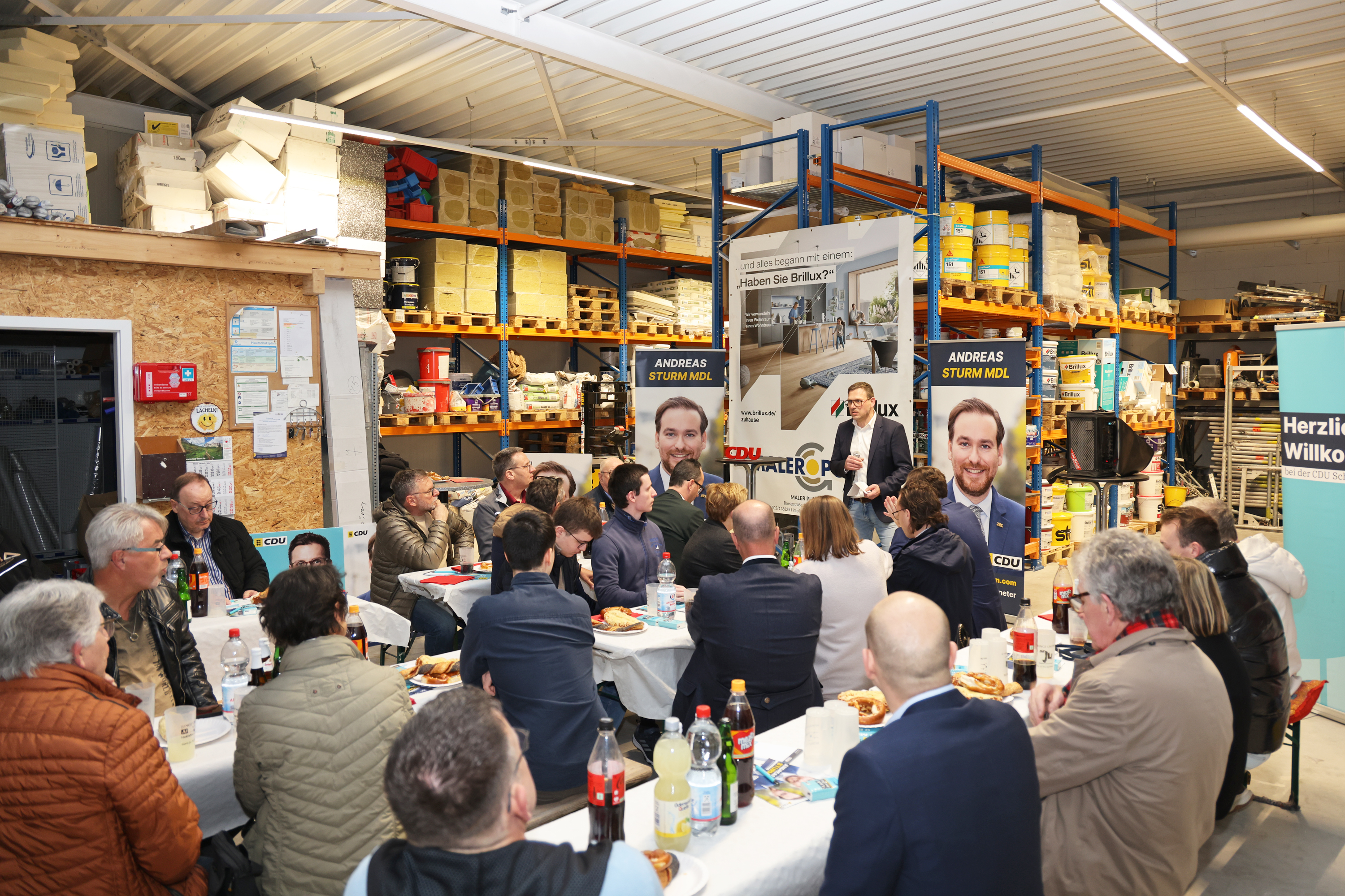 Zunächst hatte Markus Franz, Geschäftsführer der MALER PUNKT GmbH, das Wort. Er nutzte die Gelegenheit, um für Handwerk und Mittelstand zu werben. „Rund 100 Milliarden Euro Umsatz im Jahr und 800.000 Beschäftigte: Das Handwerk ist ein bedeutender Wirtschaftszweig im Land - hier gibt es sichere Arbeitsplätze und gute Löhne. Wir bilden jedes Jahr viele junge Menschen aus und bieten gute Zukunftsperspektiven“, betonte Franz. Doch Handwerk und Mittelstand benötigten verlässliche und gute Rahmenbedingungen. Der Geschäftsführer des Familienbetriebs plädierte insbesondere für mehr Planungssicherheit bei Investitionen.